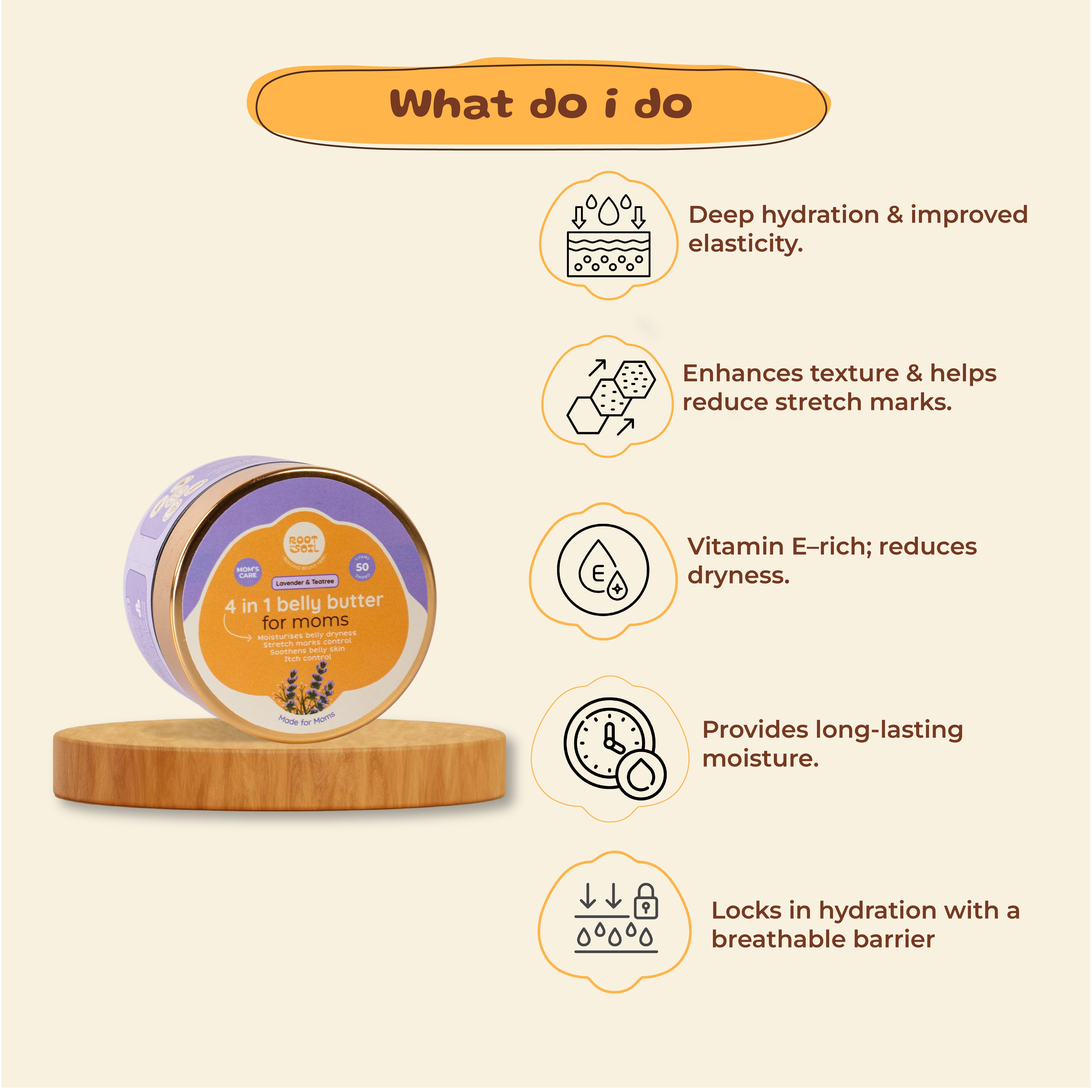 One butter, four results hydrates dry skin, calms pregnancy-related itch, softens skin, and supports visible stretch mark care. Melts into the skin with a rich, comforting texture, offering daily relief and nourishment through pregnancy and beyond.